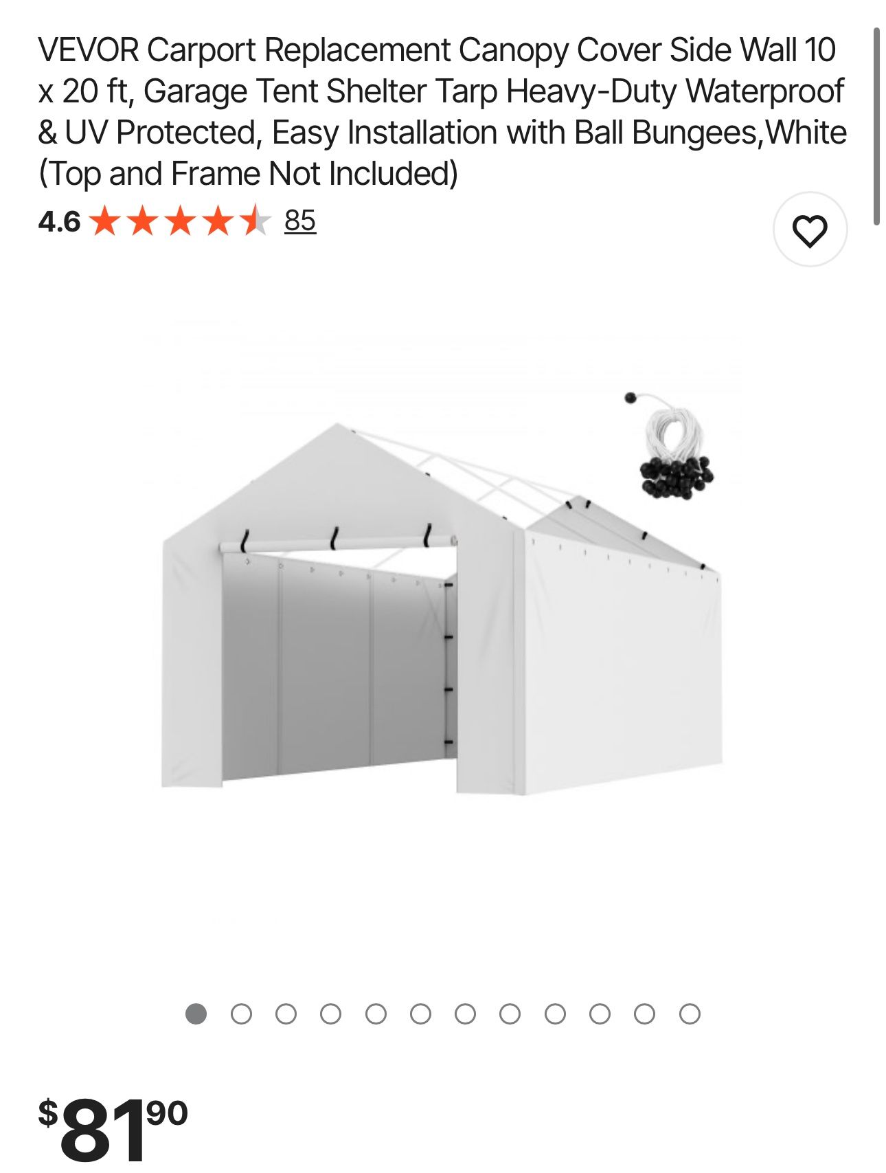 VEVOR Carport Replacement Canopy Cover Side Wall 10 x 20 ft, Garage Tent Shelter Tarp Heavy-Duty Waterproof & UV Protected, Easy Installation with Ball Bungees,White (Top and Frame Not Included)