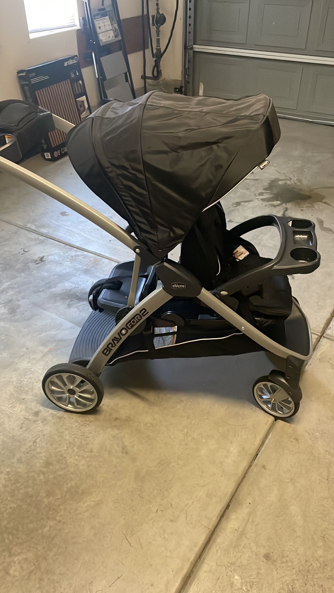 Brand Chicco Color Black Material Plastic, Metal, Polyester, Flat-Free Rubber, EVA Fabric Type 100% Polyester Frame Material Plastic, Metal Age Range (Description) Toddler 100% Polyester Imported Accommodates 2 children: front seat + back seat/platform for big kids to ride or stand Front seat folds forward to accept any Chicco infant car seat; includes 5-point harness, adjustable canopy, and detachable child tray Bonus back seat includes 3-point harness and folds up to make room for standing Standing platform features easy-grip handles and backrest Innovative fold/carry handle for a one-hand, free-standing, ultra-compact quick fold