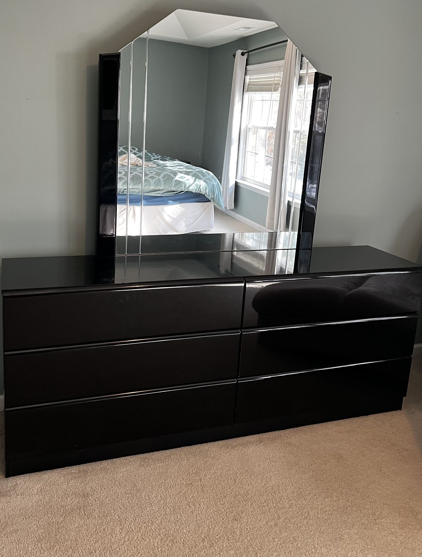 Sleek, contemporary bedroom furniture in a high-gloss black lacquer finish. Clean lines, smooth drawer fronts, and solid, heavy construction. ✔️ Millennium by Ashley Furniture ✔️ Style is no longer produced ✔️ Hard to find as a complete matching set Includes: 🗄️ 6-drawer wide dresser + beveled mirror 🛏️ Two matching nightstands ➖ Coordinating bridge/top piece 📏 Dresser approx. 74.5” W | Nightstands 24” W x 21” H 👍 Very good condition (normal light wear) 💰 Price is for the full set 📍 Pickup only