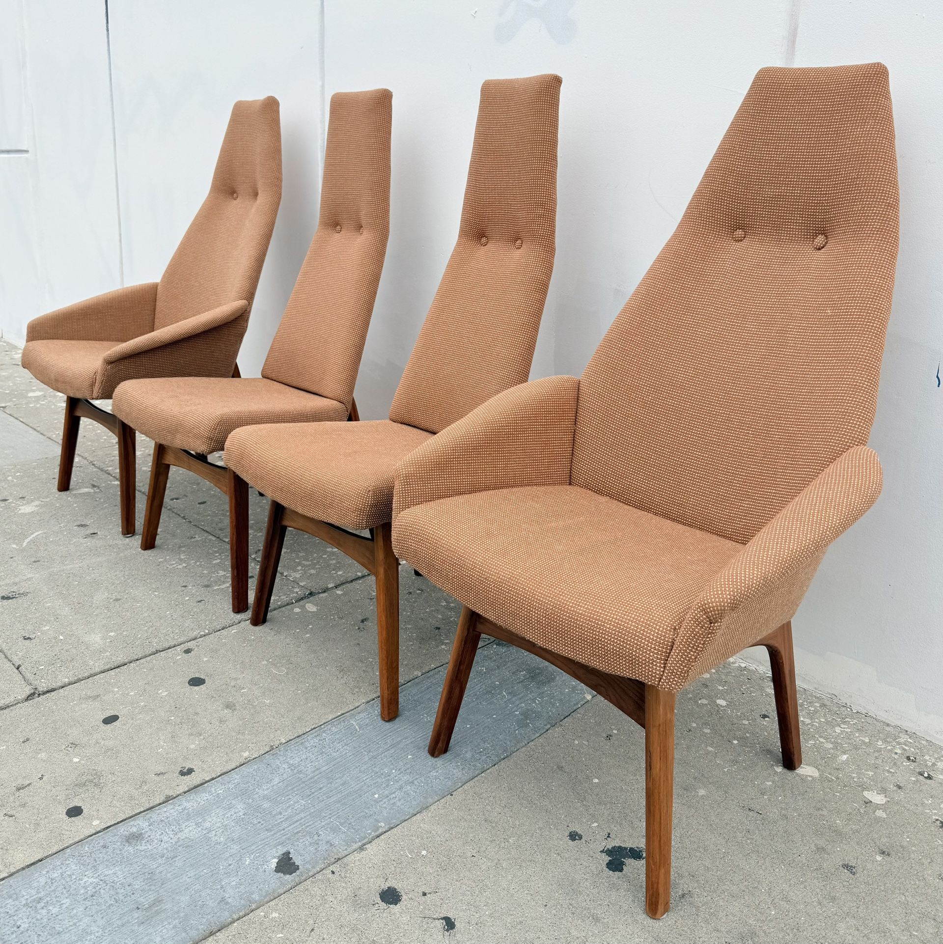 For sale is a set of four exquisite dining chairs by the imitable Adrian Pearsall for Craft Associates, circa 1960s. This sublimely comfortable set includes two armchair and two side chair variants. The design is tall, slender, and elegant, allowing the craned high back to feel light and airy in situ. The sculptural chairs stand mantis-like with delicate proportions and subtle articulations. These fabulous vintage statement chairs are in excellent condition. Local delivery available. Follow @rah__decor for more!
