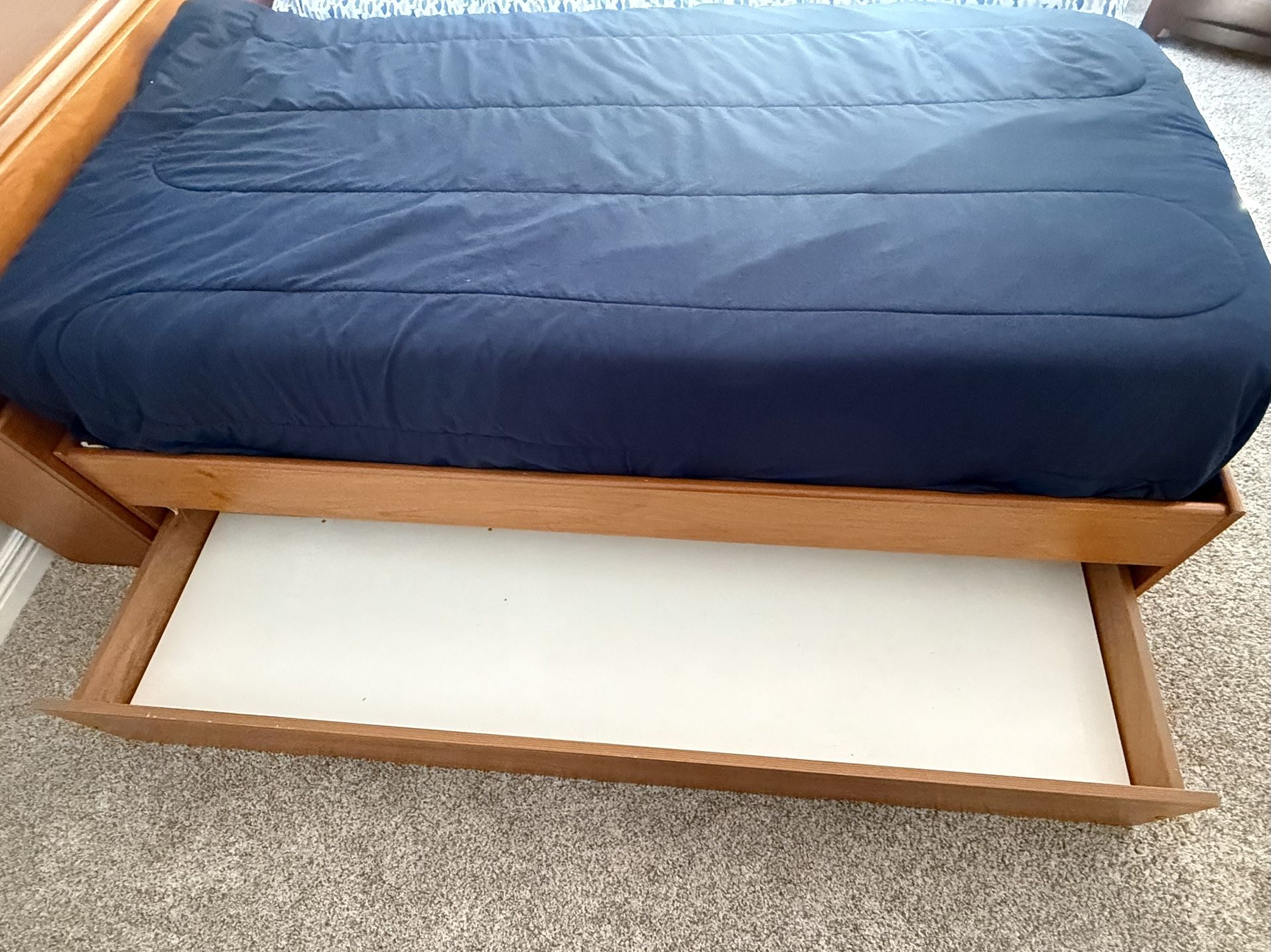 Twin bed with trundle, top mattress and headboard storage. Great shape. The trundle slides under the bed if using the top twin bed. Guest, siblings can sleep on trundle which is the size of another twin bed.