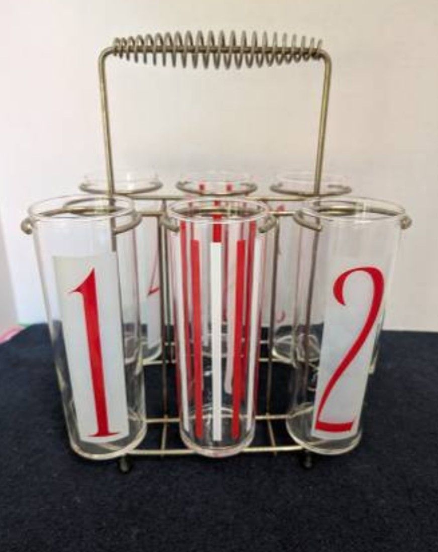 Six (6) MCM highball glasses by the Federal Glass Company. Frosted highball tumblers, each with a large red number (1,2,3,4) or matching red and white stripes. They fit into a MCM carrier. These Midcentury glasses are a bit under 7" tall x 2.5" wide and hold about 12 oz. The glasses are in great condition; the carrier has more wear but has little bit of rust and wear.
