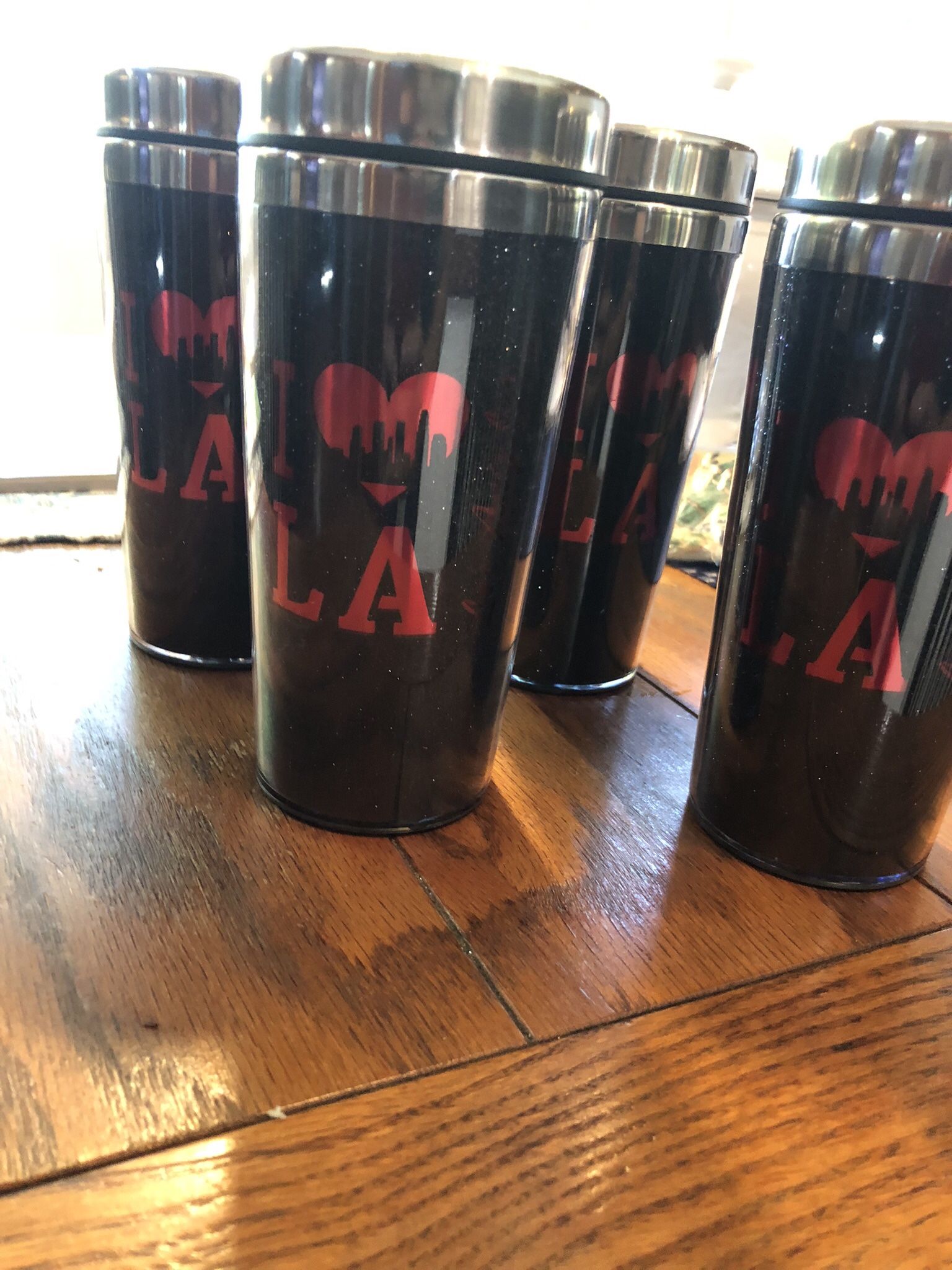 Such a deal! Four travel tumblers featuring sparkly black finish with red heart showing LA skyline and I ❤️ LA . Original price $11.99 ea.