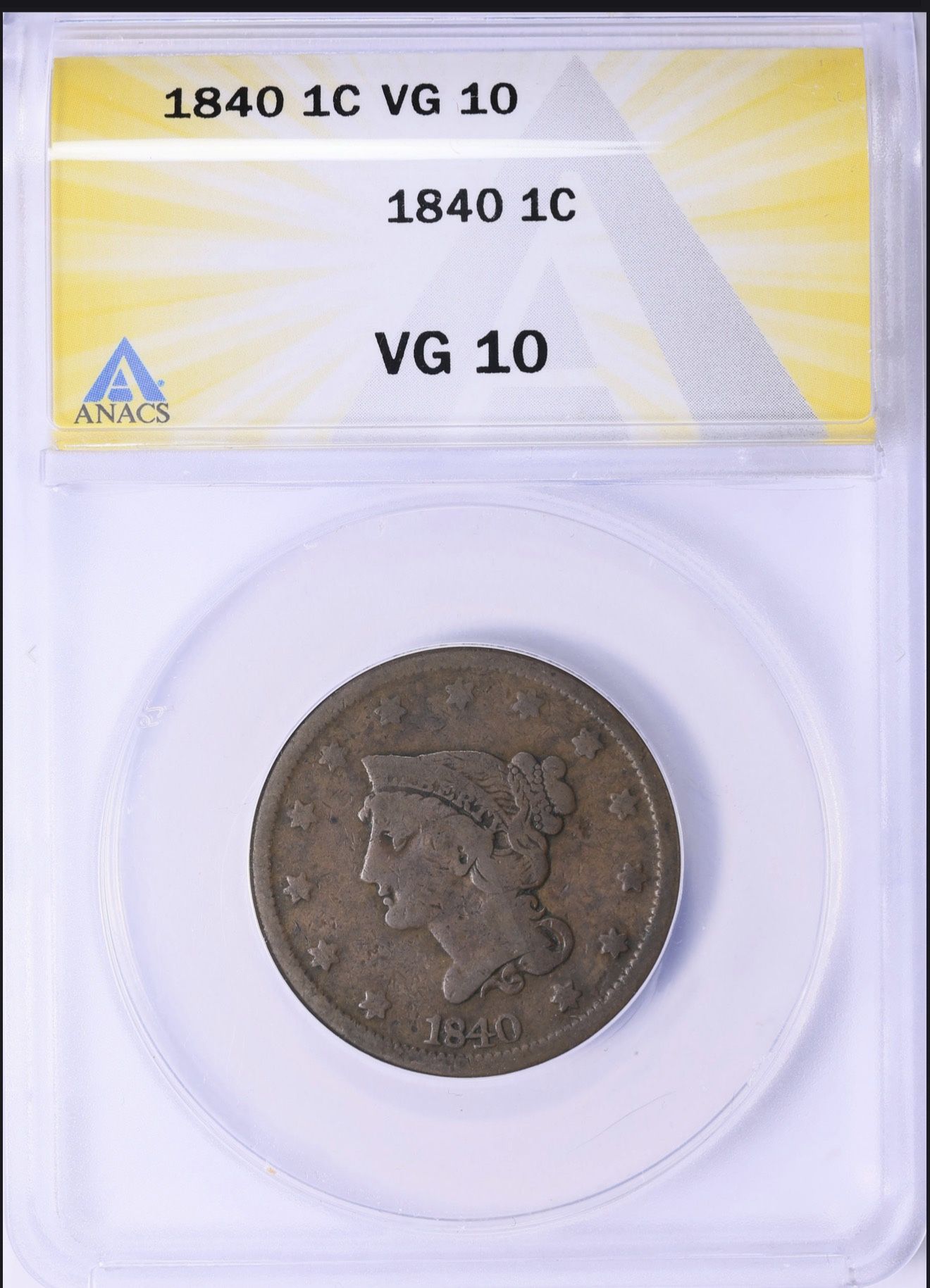 1840 Large Cent (1C) – ANACS VG10 This original 1840 Large Cent is a classic early U.S. copper coin, graded VG10 by ANACS. The coin shows honest circulation wear consistent with the grade while retaining clear date and major design elements. A solid mid-grade example from the early 19th century, ideal for type collectors or those building an early Large Cent collection. Details: • Year: 1840 • Denomination: 1 Cent (Large Cent) • Grade: VG 10 • Certification: ANACS • Cert #: 204 A dependable, third-party certified early U.S. copper with strong collector demand.