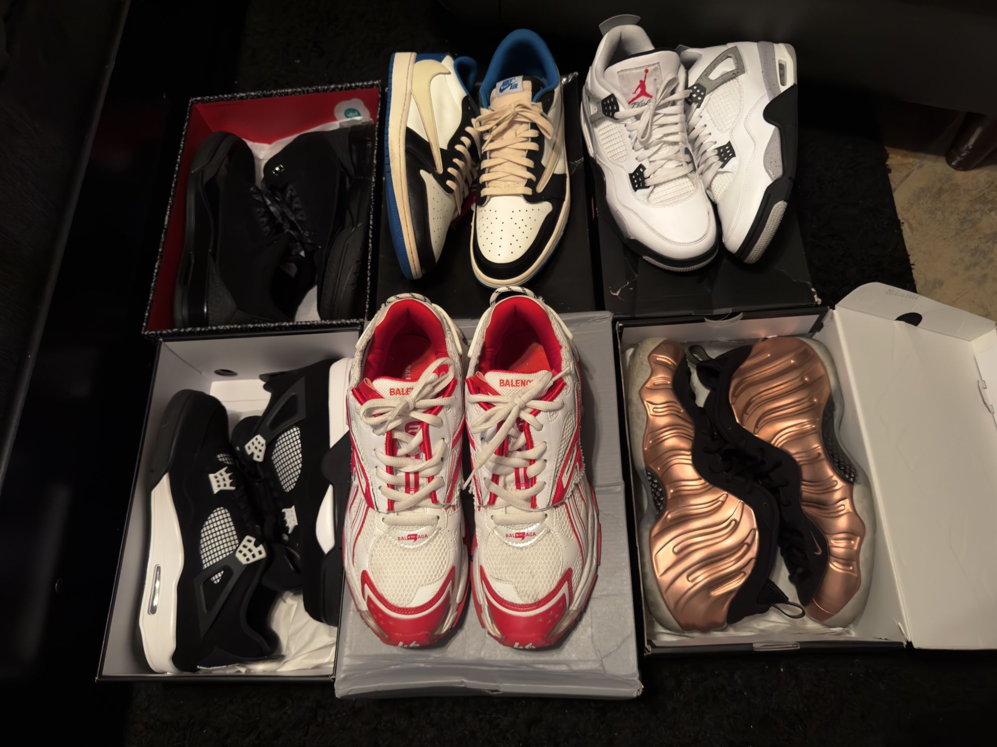 Black Cats Size 13 $140 Travis Scott’s Size 13 $200 White Cement 4’s Size 9.5 $120 White Thunder 4’s Size 12 $150 Balenciaga Runners Size 13 $150 Copper Foams Size 12 $140
