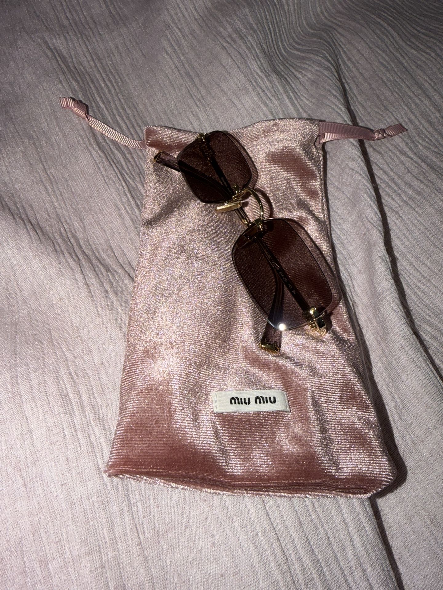 BRAND NEW. Ultra-light gold metal frame with rectangular lenses. Vertical Miu Miu logo adorns the temples. 100% UVA/UVB protection. Adjustable nose pads. Lens-nose-temple measurement: 52-20-140 mm. Comes with hard case, and blush velvet case, and cleaning cloth. See pictures for product code on inner temple