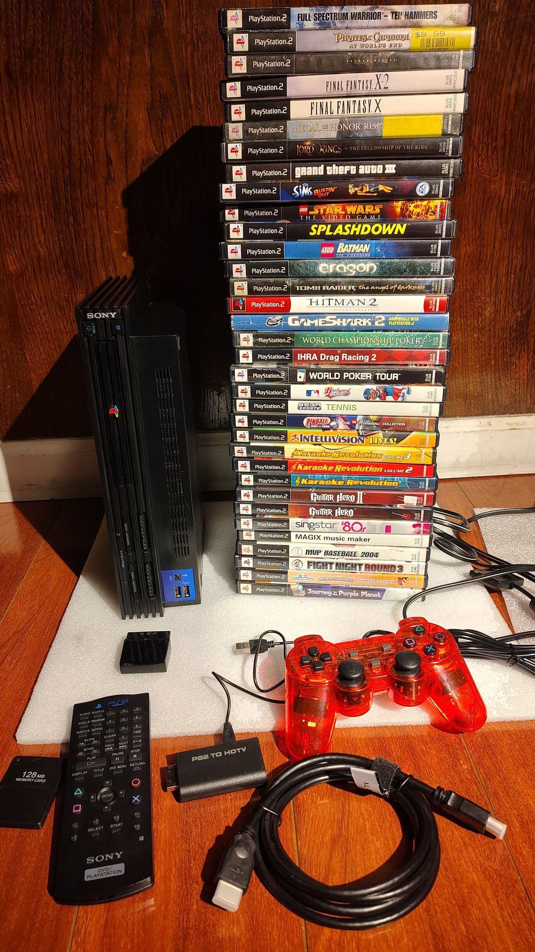 This is a PlayStation 2 3000 Series that has been fully opened, cleaned, and professionally serviced. ⚙️ Service Work Performed: Brand new power supply installed Fully cleaned inside (dust removed properly) Disc drive cleaned Laser cleaned & serviced Drive rail lubricated Worm gear serviced System tested and confirmed working These consoles are 20+ years old. Most for sale have never been opened. This one has been properly maintained — which is why it’s priced higher. 📦 What’s Included (Complete Bundle – Not Separating) PS2 3000 Console 34 Tested & Working Games 128MB Memory Card (huge storage upgrade) Brand New Aftermarket DualShock Controller (transparent red) PS2 to HDMI Adapter HDMI Cable Official PS2 Remote Wireless Remote Sensor Video proof of console working 🔥 Bundle only — will NOT separate. Please do not ask for individual items. 🎮 Game List (34 Total – All Tested & Working) Full Spectrum Warrior: Ten Hammers Pirates: of the Caribbean at worlds ends Batman Begins Final Fantasy X-2 Final Fantasy X Medal of Honor: Rising Sun Lord of the Rings: The Fellowship of the Ring Grand Theft Auto III The Sims: Bustin’ Out Lego Star Wars: The Video Game Splashdown LEGO Batman Eragon (Factory Sealed) Tomb Raider: The Angel of Darkness Hitman 2 GameShark 2 World Championship Poker IHRA Drag Racing 2 World Poker Tour Backyard Baseball 10 Tennis Sega Sports PinBall Hall of Fame Intellivision Lives! Karaoke Revolution Volume 3 Karaoke Revolution Volume 2 Karaoke Revolution Guitar Hero Guitar Hero II SingStar 80s (Factory Sealed) MAGIX Music Maker MVP Baseball 2004 Fight Night Round 3 DinoSasurs Shapes and Colors Dora Journey to Purple Plant A real grail 📀 Game Condition All discs professionally cleaned & polished on a disc machine All games tested on this console Some cases show wear (normal for age) Some box art reprints A few factory sealed titles (Batman, Eragon, SingStar) Everything plays. 🖥 Console Condition Exterior has minor cosmetic wear (normal for age) Inside is clean and serviced Reads discs properly HDMI ready for modern TVs 💰 Why It’s Priced Higher Most PS2s listed are dusty, untouched, and risky purchases. This one has been opened, cleaned, serviced, and tested. You’re paying for:. ..✔ Reliability ✔ Service work ✔ Large memory card ✔ HDMI setup ✔ Complete ready-to-play bundle Also please don't ask for x item. Price is firm only contact me if you are ready to buy everything. Bundle only