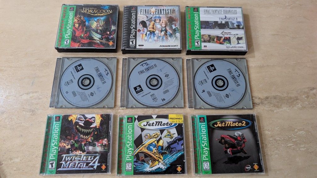 Final Fantasy IX case is broken and comes apart but manual and CDs are intact. Prices for each are below. Bundle deal for all remaining games $120. The Legend of Dragoon - $30 Final Fantasy IX - $30 Final Fantasy Chronicles - $30 Final Fantasy XII - $30 Twisted Metal 4 - SOLD Jet Moto - $10 Jet Moto 2 - $10 Prices are firm, will only meet in South Arlington area.