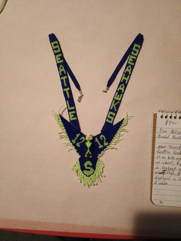 7000+ beads, 80+ hrs, Seattle Seahawks on straps, 12 on both wings, space needle on chest,big S on tail. All in Seahawk green. 21 in straps w/ sterling clasp. All beautifully displayed in 15 beads with Seahawk blue green and white.