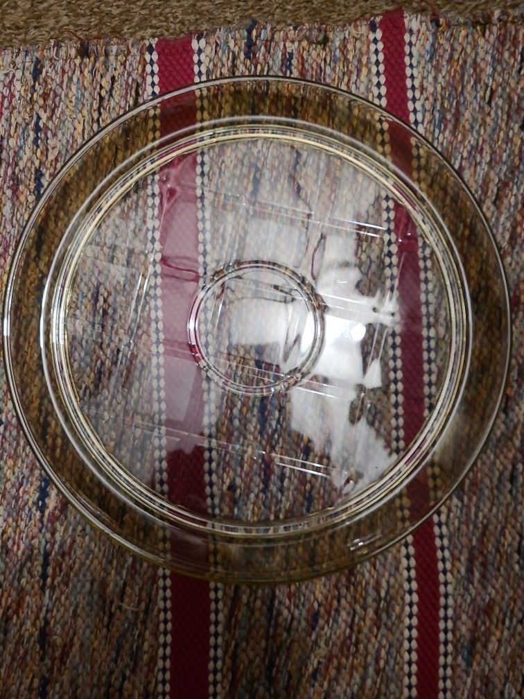 13" diameter. Smoked glass. Raised on the bottom and recessed slightly in center. Heavy rare smoked platter