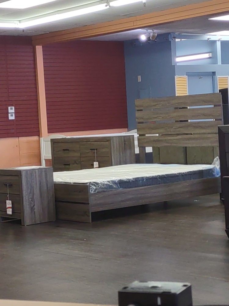It is set up for viewing in store we also offer shipping with a shipping fee comes with a bedframe dresser and nightstand