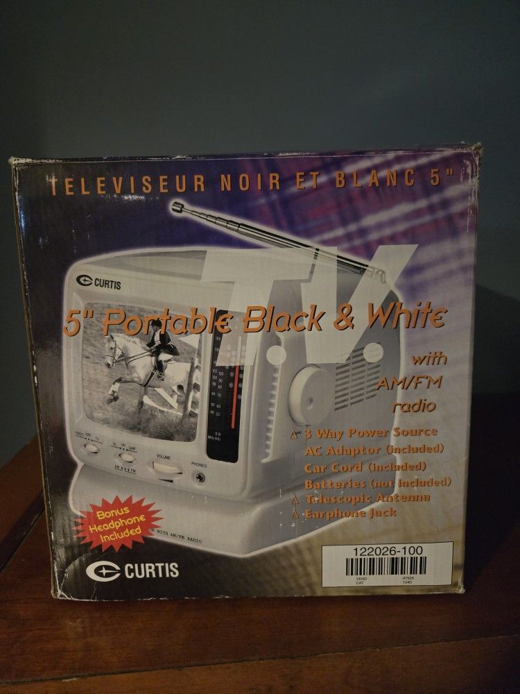 Old-school black and white 5 inch television with AM/FM radio. Everything pictured is included. Box and Manuals in good shape!