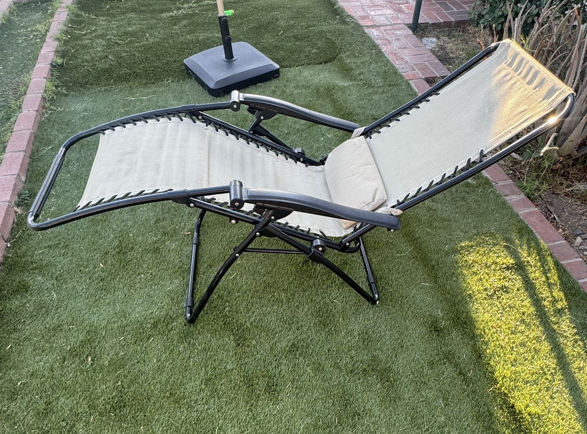 Foldable Zero Gravity Chair - Used, Good Condition Relax in comfort with this foldable zero gravity chair. It’s used and has some visible scratches from normal use, but it’s still in good working condition. Folds easily for storage and transport, and the locking mechanism functions smoothly. Great for the backyard, patio, or even camping. - Folds for easy storage - Comfortable reclining position - Minor cosmetic wear, fully functional
