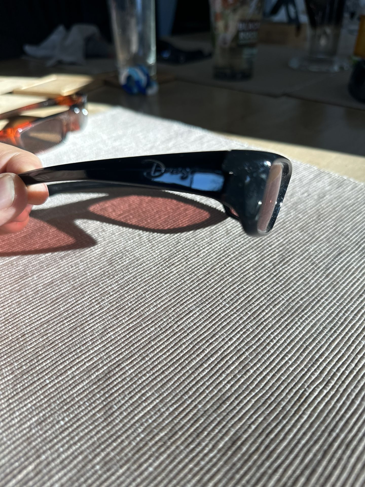 Sunglasses. No scratches. Comes with carry bag. Purple lens black frame