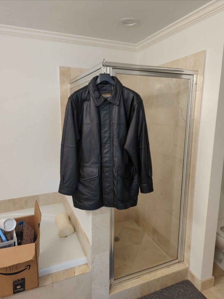 New Black Leather Jacket Purchased at Bloomingdale's Moved to Florida After Purchase Never Worn, Not Even Once Heavy Duty Jacket Rich Diamond Shape Lining Large interior pocket Leather Interior Pocket For Cellphone Adjustable Waiste with Pull Cord in Interior