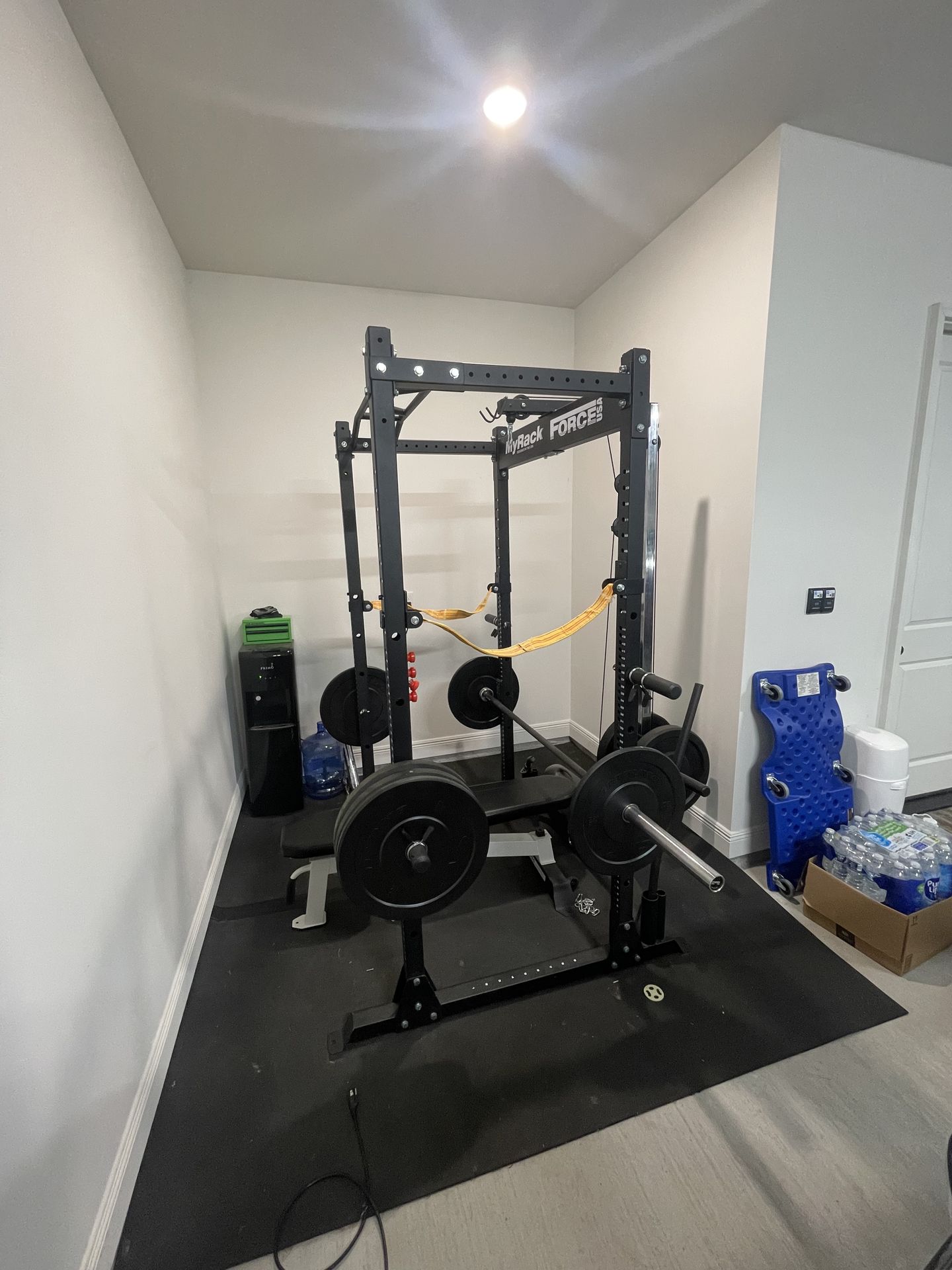 Power rack, lat pulldown, pull-up bar, bench, barbell and weights