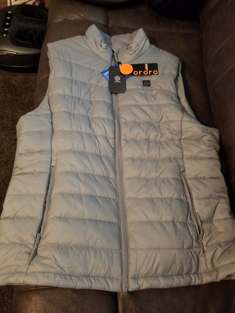 Ororo women's heated vest with 5 heating zones, neck, chest, back and both pockets. 3 heating levels, low, med and high. Brand new, never used. Comes with charger, battery (charged), instructions and mesh bag. Machine washable. This runs small, so the XL is like a LG. Regularly $169, on sale at Amazon for $129. $100 firm