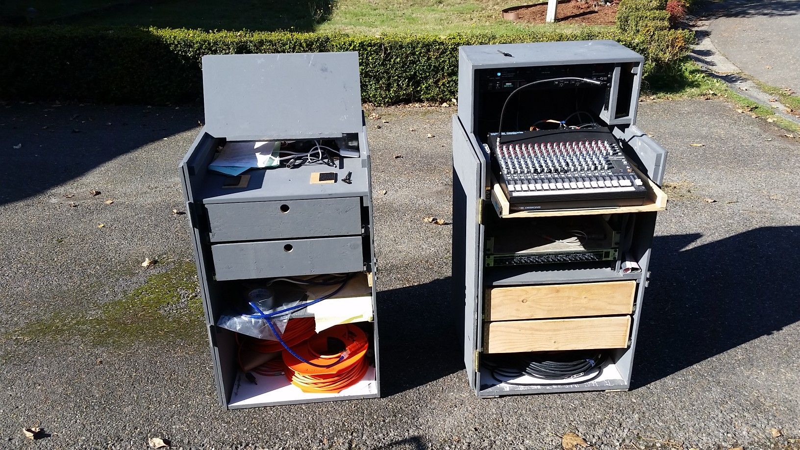 Sound and lighting tech touring cases. Shop built to be a quick set up for full sound system and light system. There are 2 storage cases. Sound case: Pre wired for sound board and audio equipment. 10 rack spaces, 4 above the board, 6 below. 2 source drawers, and a shelf. Rear door has a rack for up to 100' snake. Box fits on a standard hand truck for easy handling. Includes the following equipment Fuhrman pl-plus lighted power conditioner, Yamaha SPX90 effects generator Makie CR-1604 sound board (mixer) DOD 15 band stereo equalizer Beringer multi com 4 channel compressor/ limiter / gate 6 SM 58 style microphones Misc. Cords and adaptors Lighting case Opens with lid to hold script, space for lighting console, drawers and shelves for storage $500 takes both boxes with all the equipment installed. Or $150 takes both boxes empty.