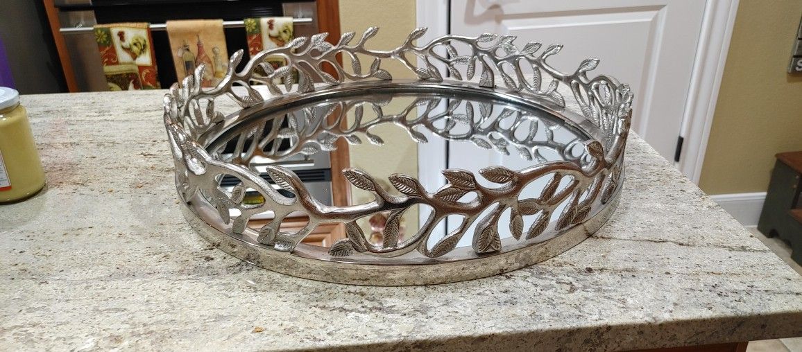 Large (21.25" Diameter) ornate, cast aluminum leaf motif framed mirrored tray...made in India