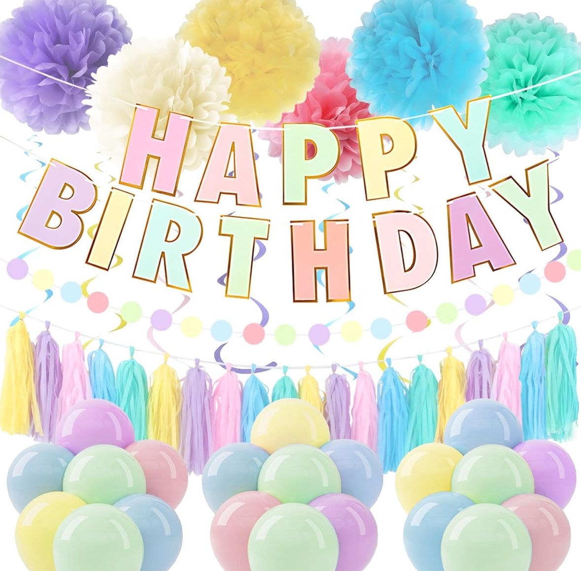 Macaron Pastel Happy Birthday Party Decorations for Women Girls with Happy Birthday Banner,Paper Tassel,Tissue Paper Pompoms, Hanging Swirl,Circle Gar
