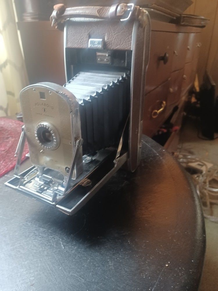 1940's Polaroid Model 95 Land Camera. Appears to be in amazing condition. I have no clue how to work these though so I wouldn't know if it works. However, I have 3 radios also from the 1940's that do work. I'd be genuinely surprised I'd this camera doesn't work. Comes with 11 blue bulbs & leather case!
