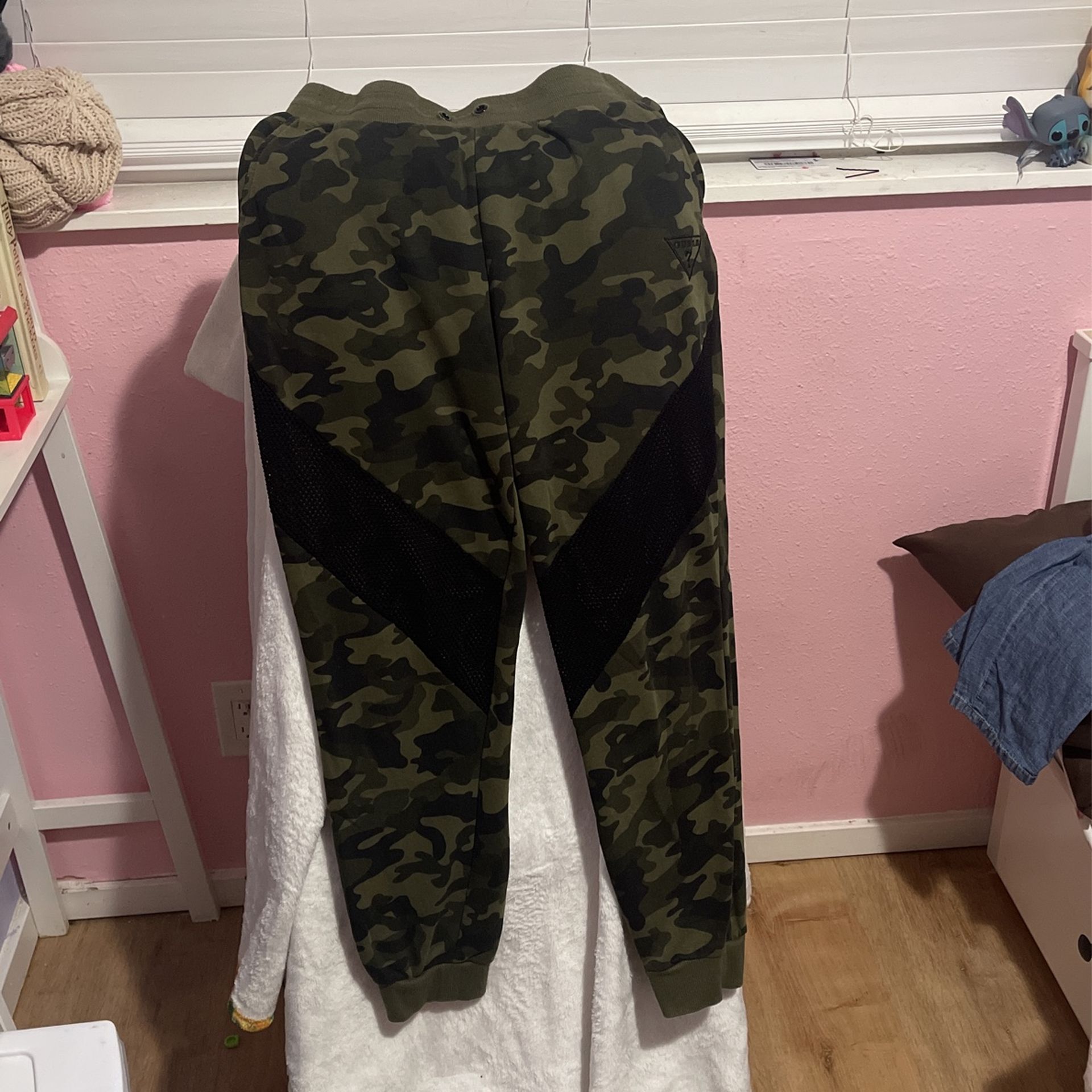 Matching GUESS sweatpants and sweater with camo pattern. Excellent condition. Pants size S, sweater size M.