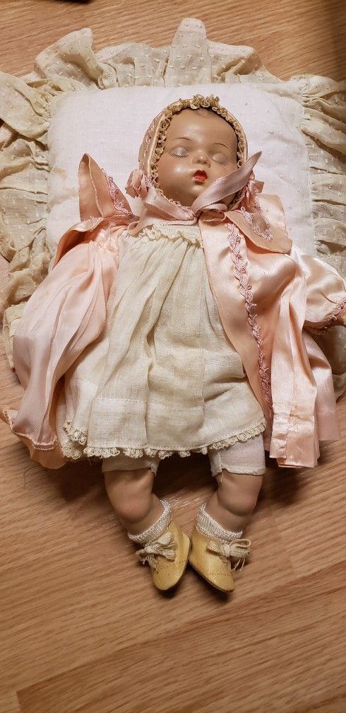 Pictures are the best description Antique Madame Alexander Collector early 1900's Pinky Doll - great for a photo Prop Has Molded Hair, Crier, Sleep Eyes shut So beautiful with detailed hand-painted brows, lower lashes, and lips. Her eyes are closed SMOKE and pet FREE HOME I am not sure the age other than I got it from my 78 year old adopted mother figure. Guess its from the 30 or 40's Doll is 11 inches long