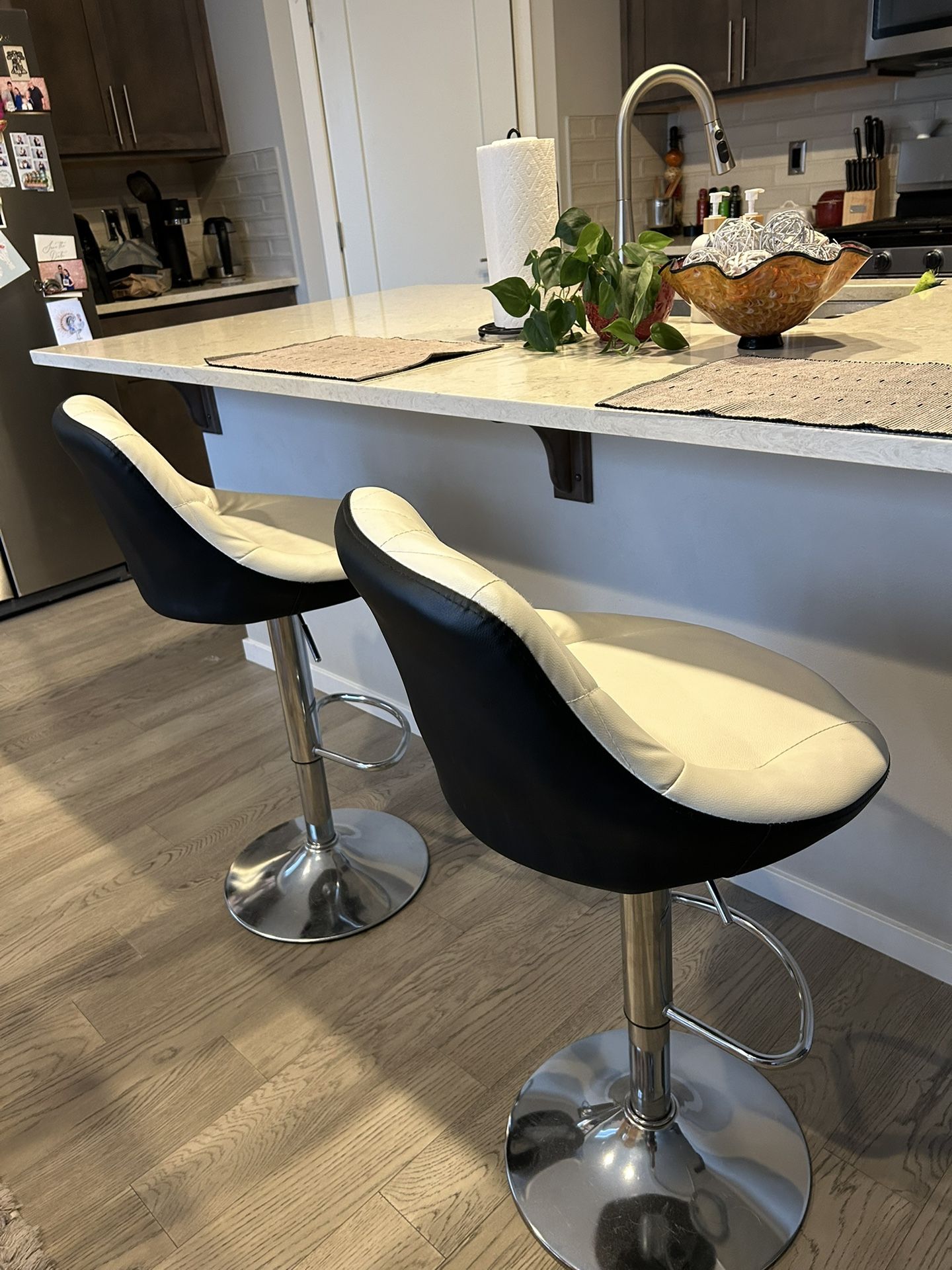 Selling a set of 2 modern bar stools in great condition. • Soft cushioned white seats • Swivel and height-adjustable • Chrome base with built-in footrest • Perfect for kitchen islands, bars, or high counters Condition: Gently used, well-maintained.