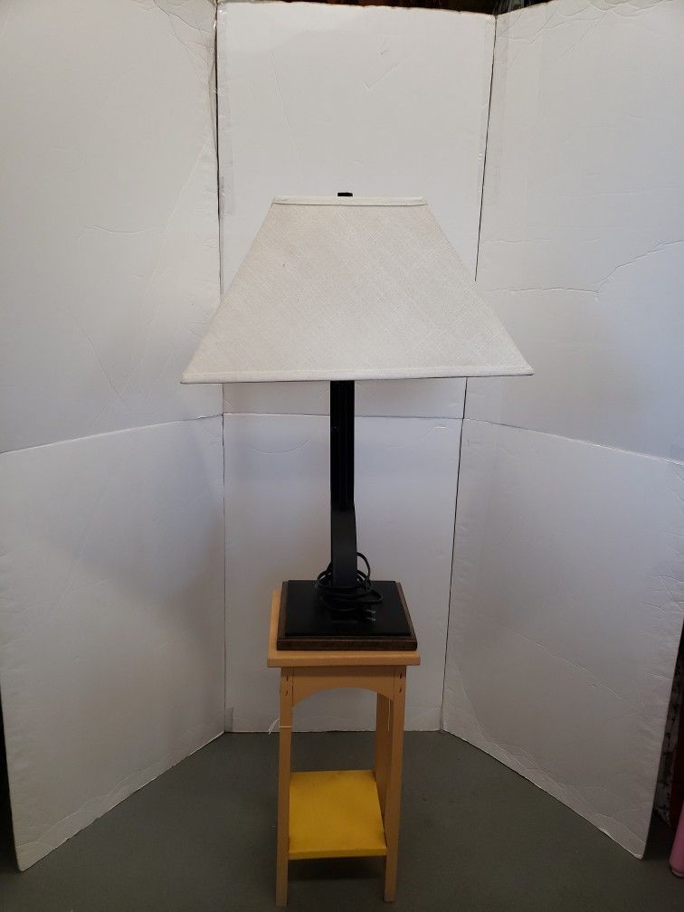 Selling a office lamp with a off white square large lamp shade a black metal rod body frame with a black and brown base a pull chain for the light switch very clean sturdy and in good working condition.( dim: 26" tall)