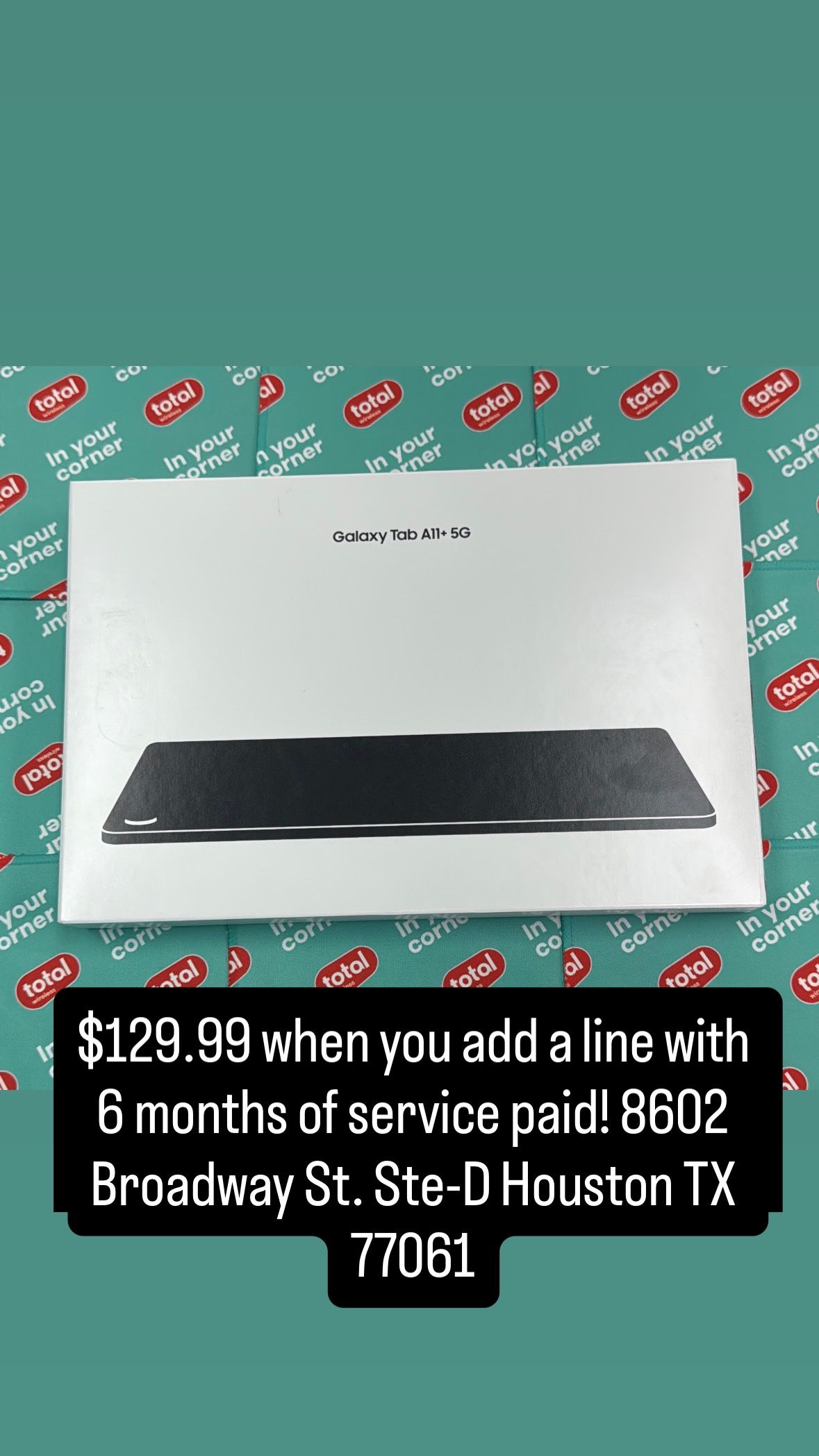 I have a Samsung A11+ 5G tablet for $129.99 when you add a line with Total Wireless. This is a new 2026 model with 128GB of memory a front and back camera and a long battery life for all day use. I’m located at 8602 Broadway St. Ste-D Houston TX 77061