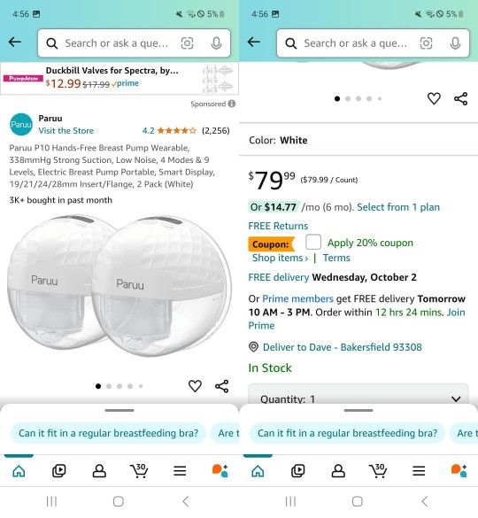 Paruu P10 Hands-Free Breast Pump Wearable, 338mmHg Strong Suction, Low Noise, 4 Modes & 9 Levels, Electric Breast Pump Portable, Smart Display, 19/21/24/28mm Insert/Flange, 2 Pack (White)