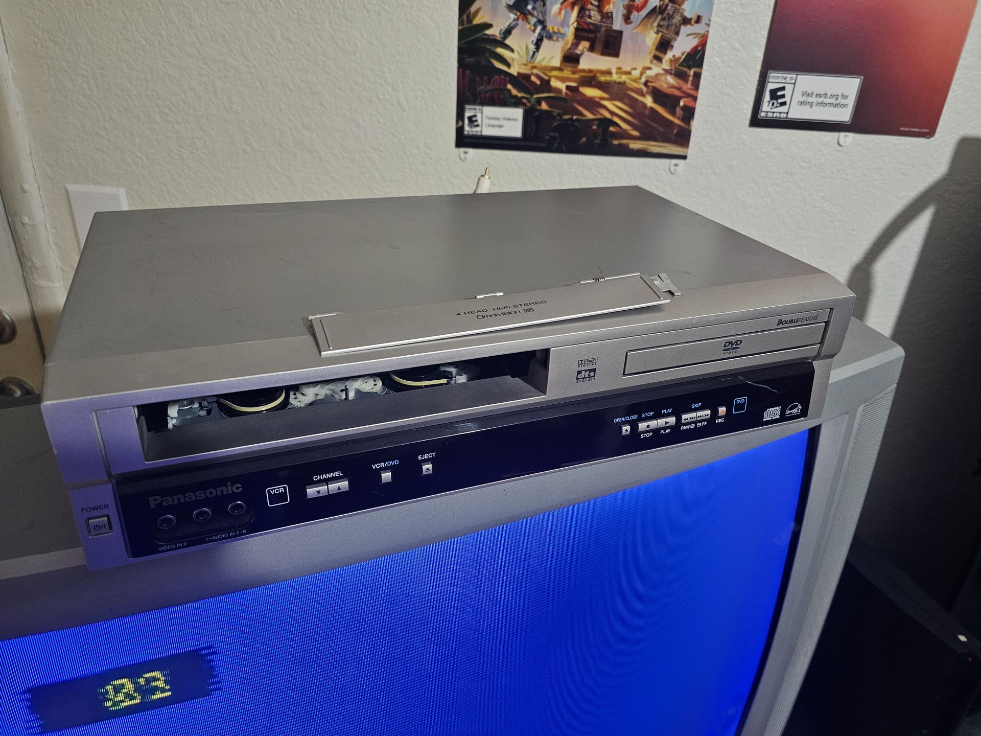 Panasonic VHS DVD Combo Model# PV-D734S So... I mean it works? Missing the flap for the vhs cassette side but it still plays. And technically the dvd side works but the main gear that opens and closes the tray broke so it wont open on its own... No remote but comes with cords and i do still have the flap and gear if wanted.