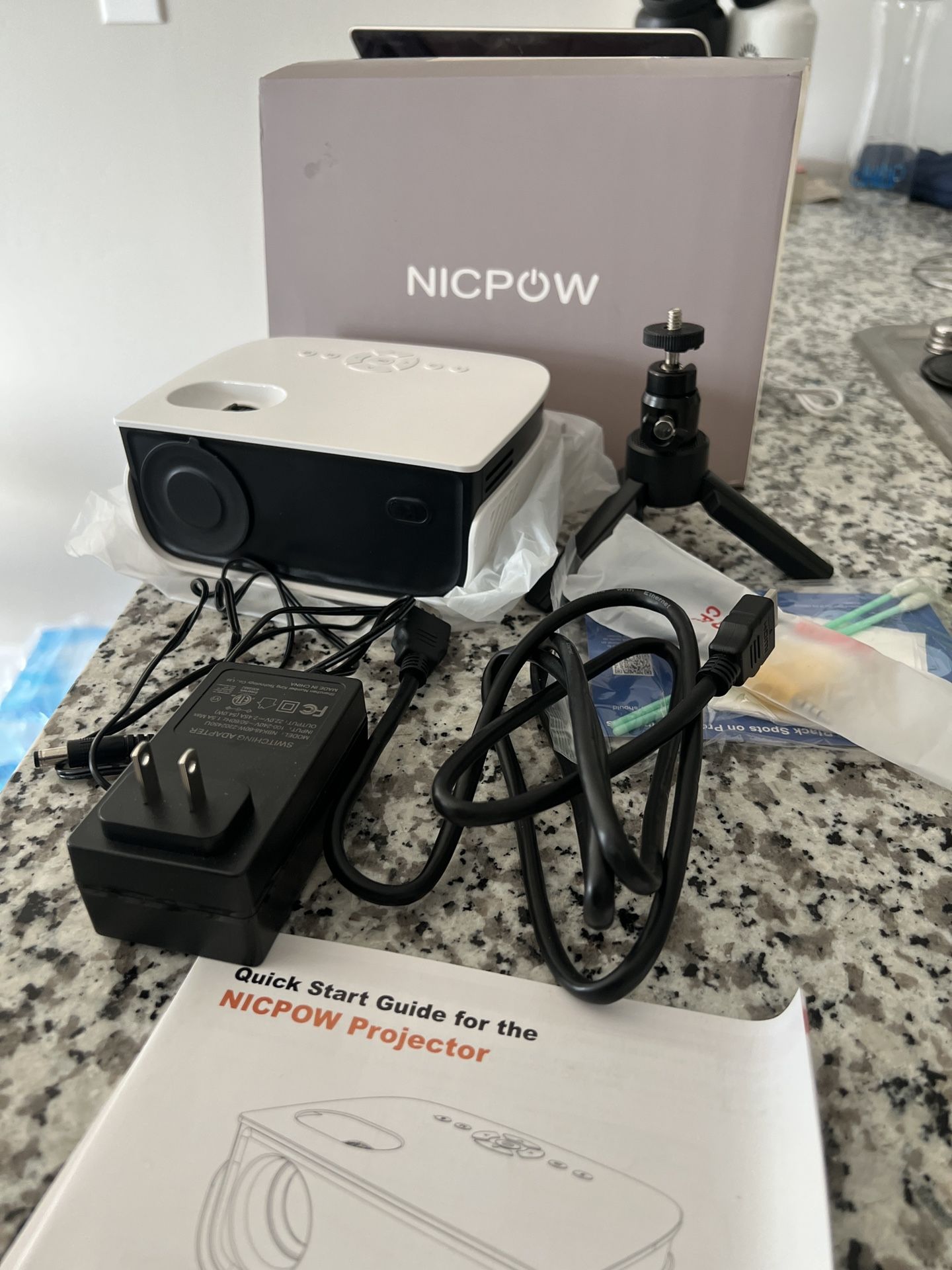 like-new condition. Only used 2 times. Works perfectly. Includes projector, power cord, HDMI cable, mini tripod, and original box. Great for movies, gaming, or presentations. Easy to set up. $5 delivery