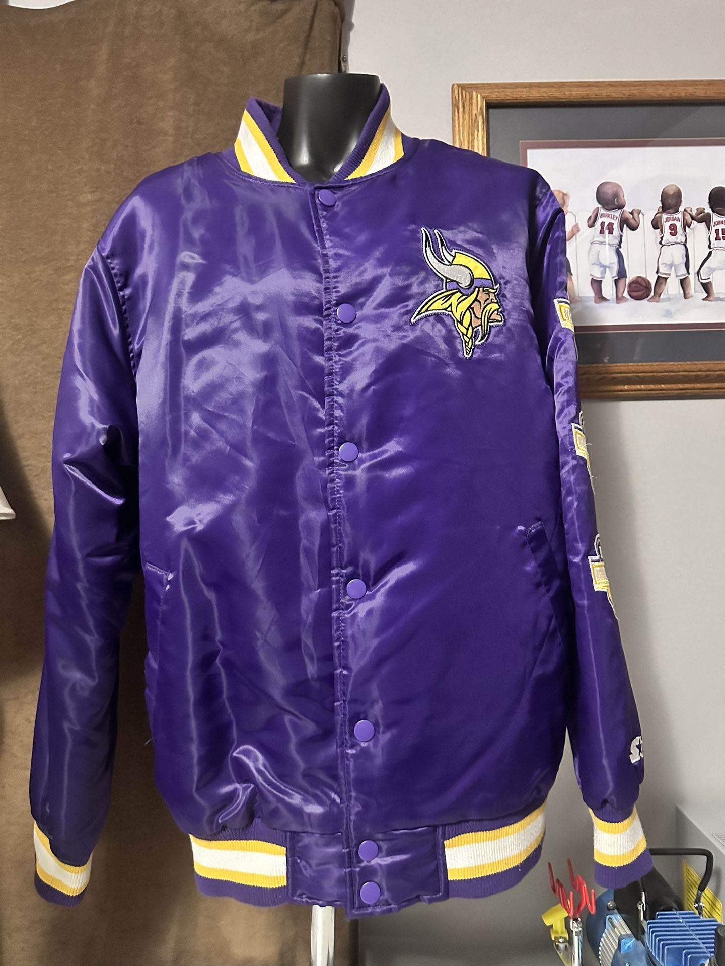 Lightly worn men’s size XL vintage 90’s Sneaker Villa x Starter “The Experience Missing Rings” Jacket. Back in the day the “Sneaker Villa in Philadelphia added this Vikings Jacket to their “Villa The Experience” collaboration with Starter brand and features a purple satin outer shell and gold satin inner lining with 1973, 74, & 76 NFC Championship wins down left sleeve along with white and gold on the sleeves and collar. . Still in amazing condition for 30+ years old with no holes or stains. Been hanging in closet for years.