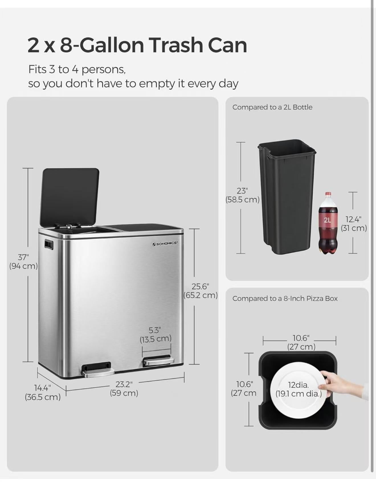 Trash Can, 2 x 8 Gallon (2 x 30 L) Garbage Can for Kitchen, with 15 Trash Bags, 2 Compartments, Plastic Inner Buckets and Hinged Lids, Airtight, Silver and Black ULTB60NL