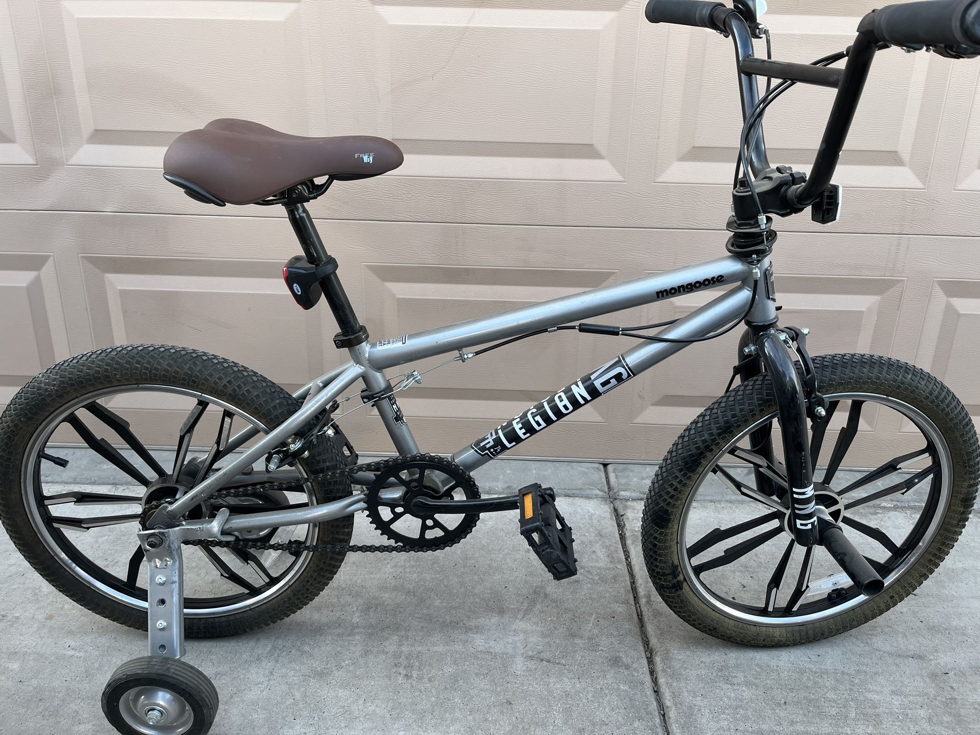 20” MONGOOSE LEGION BMX BIKE EXCELLENT CONDITION WITH a Freshly tune up upgrades: heavy duty training wheels, wider seat, rear and front led head lights