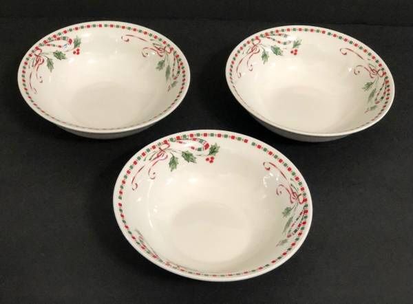 Gibson Designs Festive Traditions 6 3/8” Soup / Cereal Bowls Set of 3. Never used. In excellent condition. Pattern Description: Red and Green Squares and Ribbon with Holly and Berries. Sold between 2005 - 2011. Dishwasher, microwave, and oven safe. Pattern is the same as Tartan Ribbon by Home Essentials. Perfect for cereal, soups, salads, desserts, etc. Fast shipping. I have seven bowls. I am listing them together and in groups of four and three.