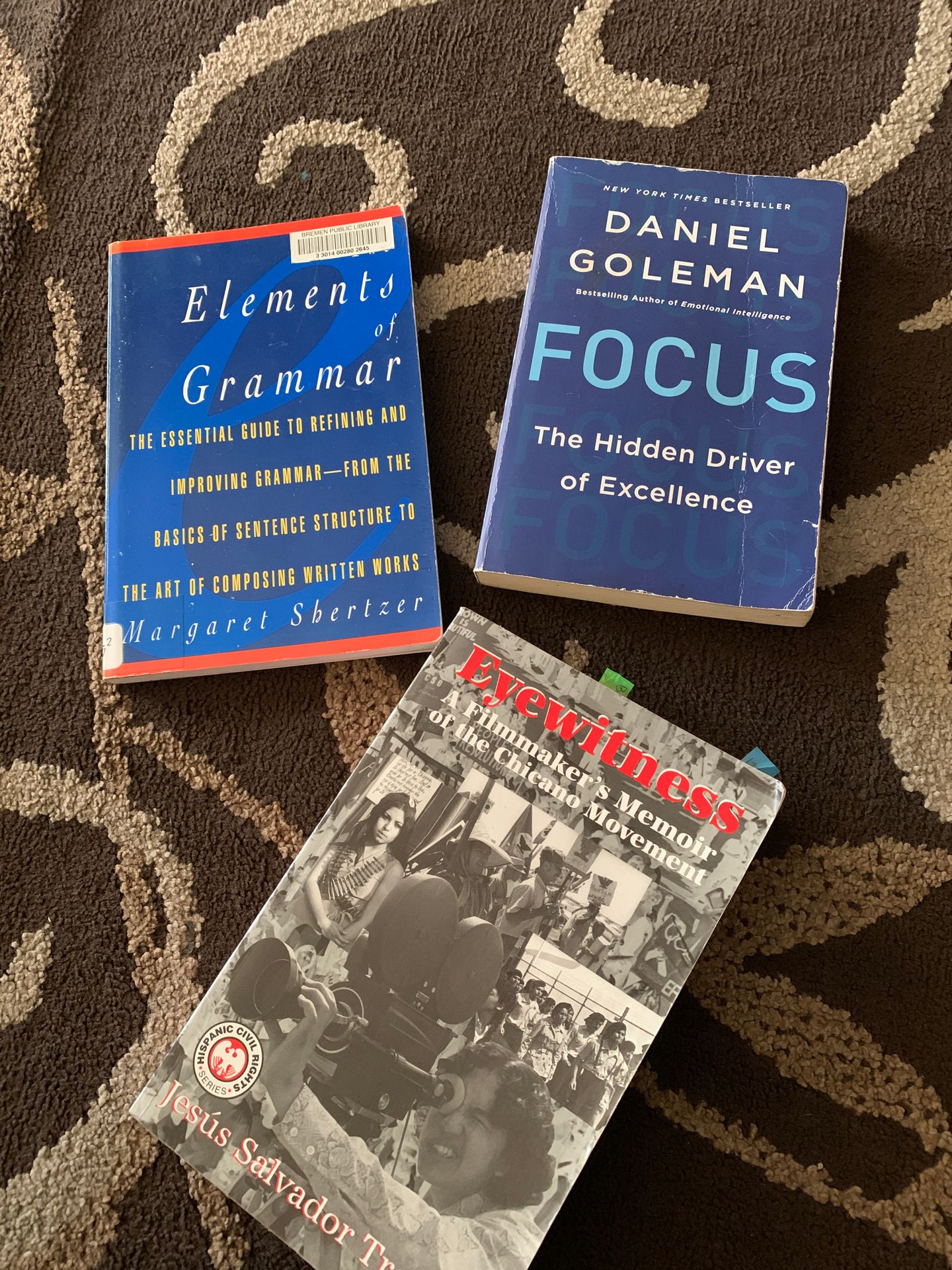 The Elements of Grammar- Margaret D. shertzer $5 Focus The Hidden Driver of excellence- Daniel Goleman $10 Eyewitness A Filmmakers Memoir of the Chicano Movement- Jesus Salvador Treviño $5 Books used @ SBVC for English 914 and Chicago History.