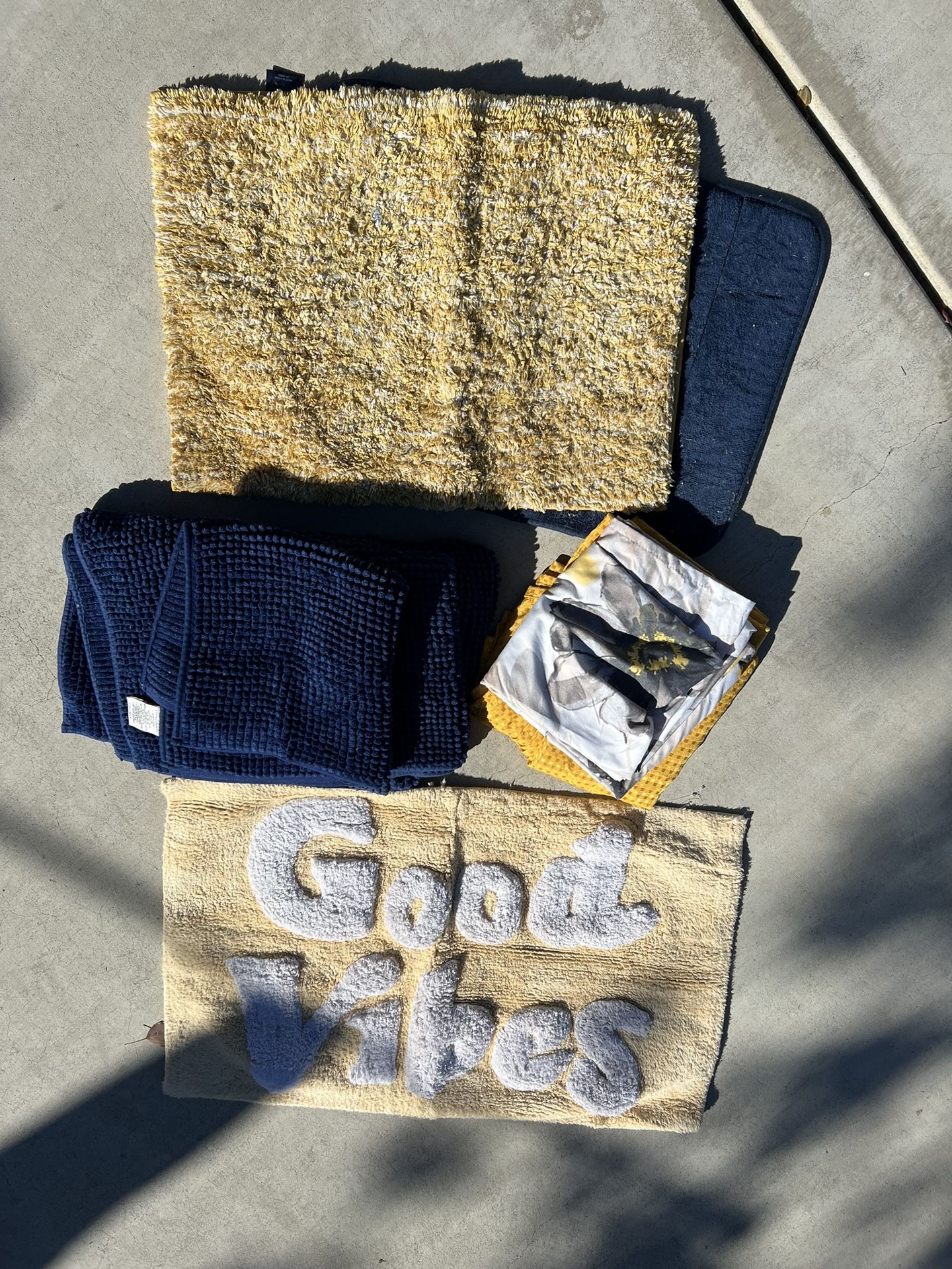Yellow and blues… 2 shower curtains, and multiple rugs…. $40 obo like new