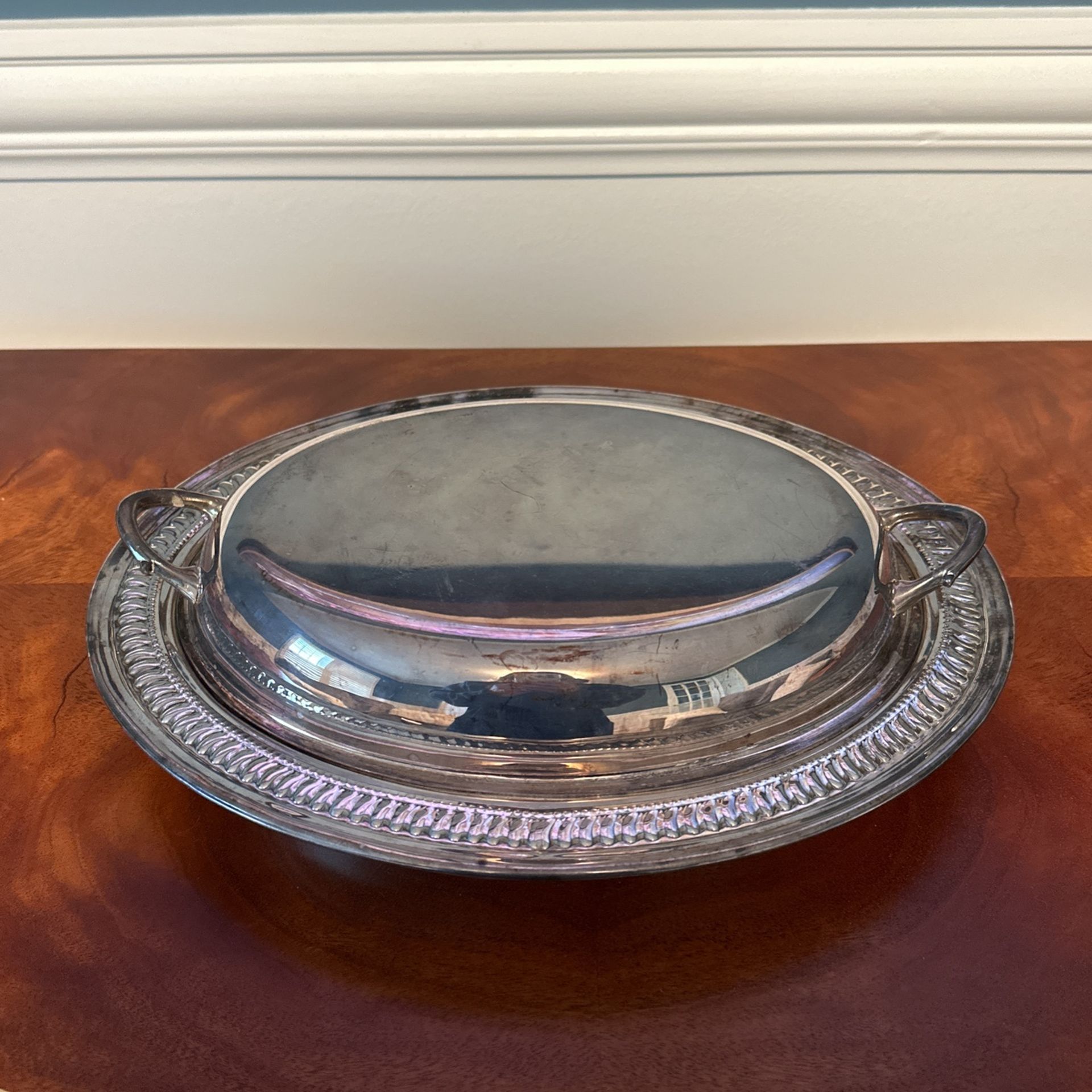 Vintage Oval serving dish with handled lid. Stamped LH SILVER PLATED.