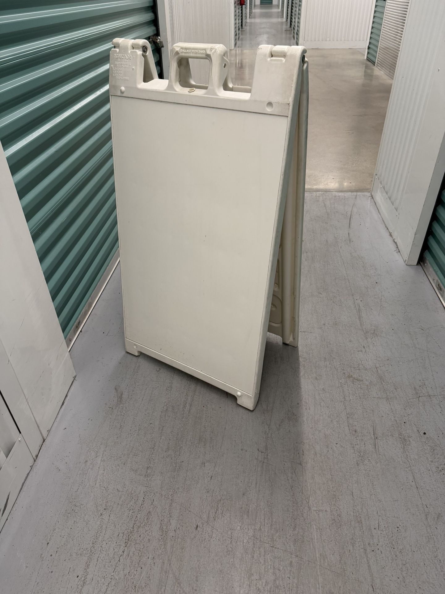 Plastic A-frame sidewalk sign (Signicade style). Great for real estate, small business, events, or storefront advertising. Features: • Durable molded plastic • Folds flat for storage • Blank panels – ready for vinyl, markers, or inserts • Stable A-frame design Condition: • Good overall shape • Normal cosmetic wear from use • Hinges intact Cash only