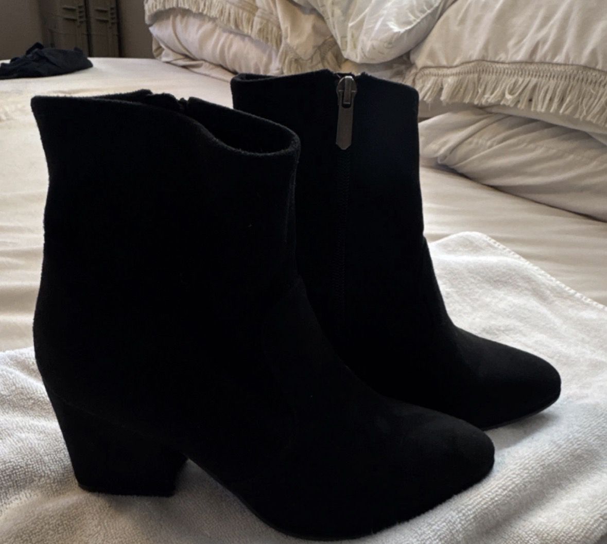 Used black faux suede booties with zipper closures. Size 8.