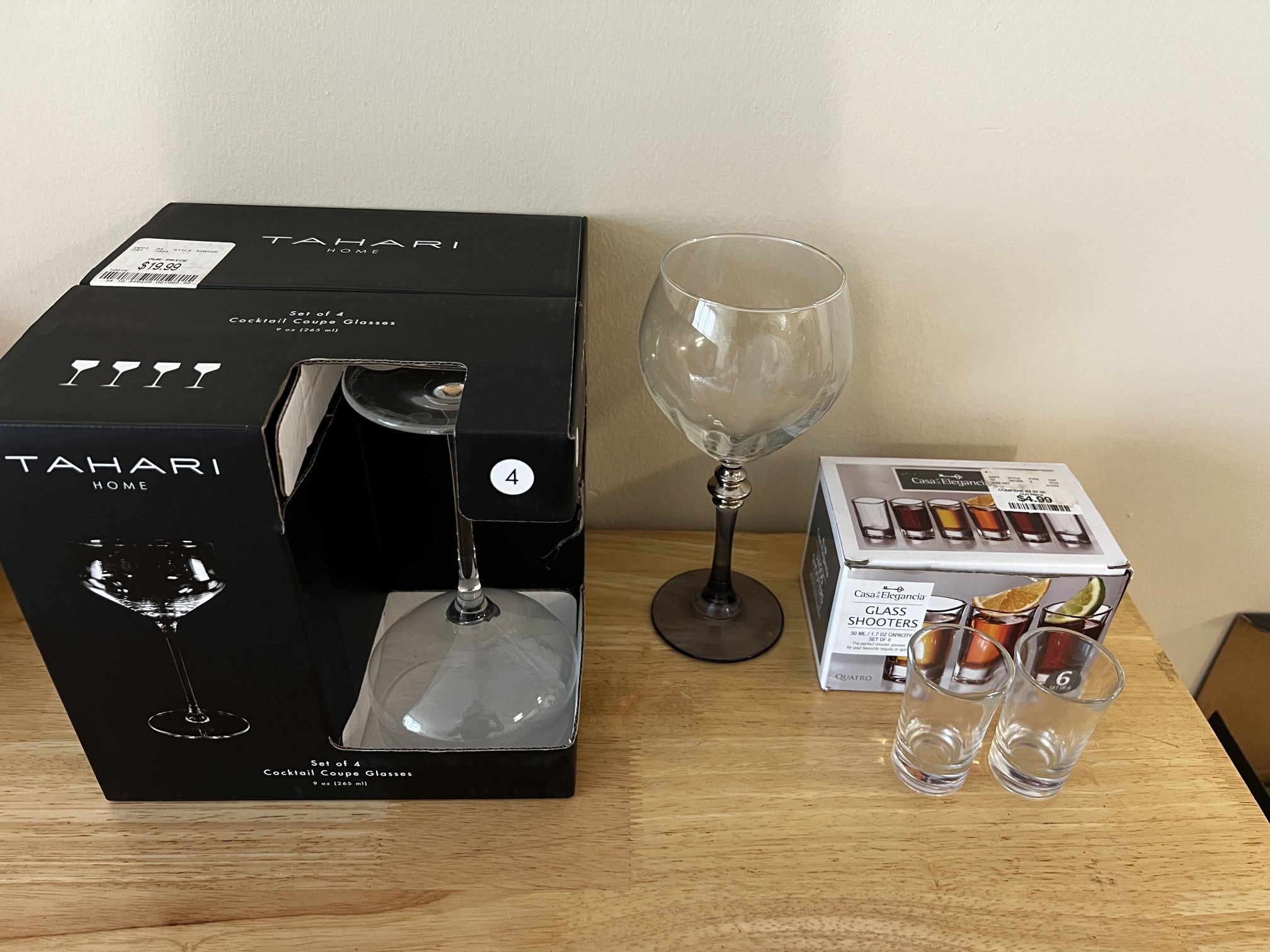 4 cocktail coupe glasses 1 beautiful blue handle wine glass 6 shot glasses All for $10 pick up at ktown