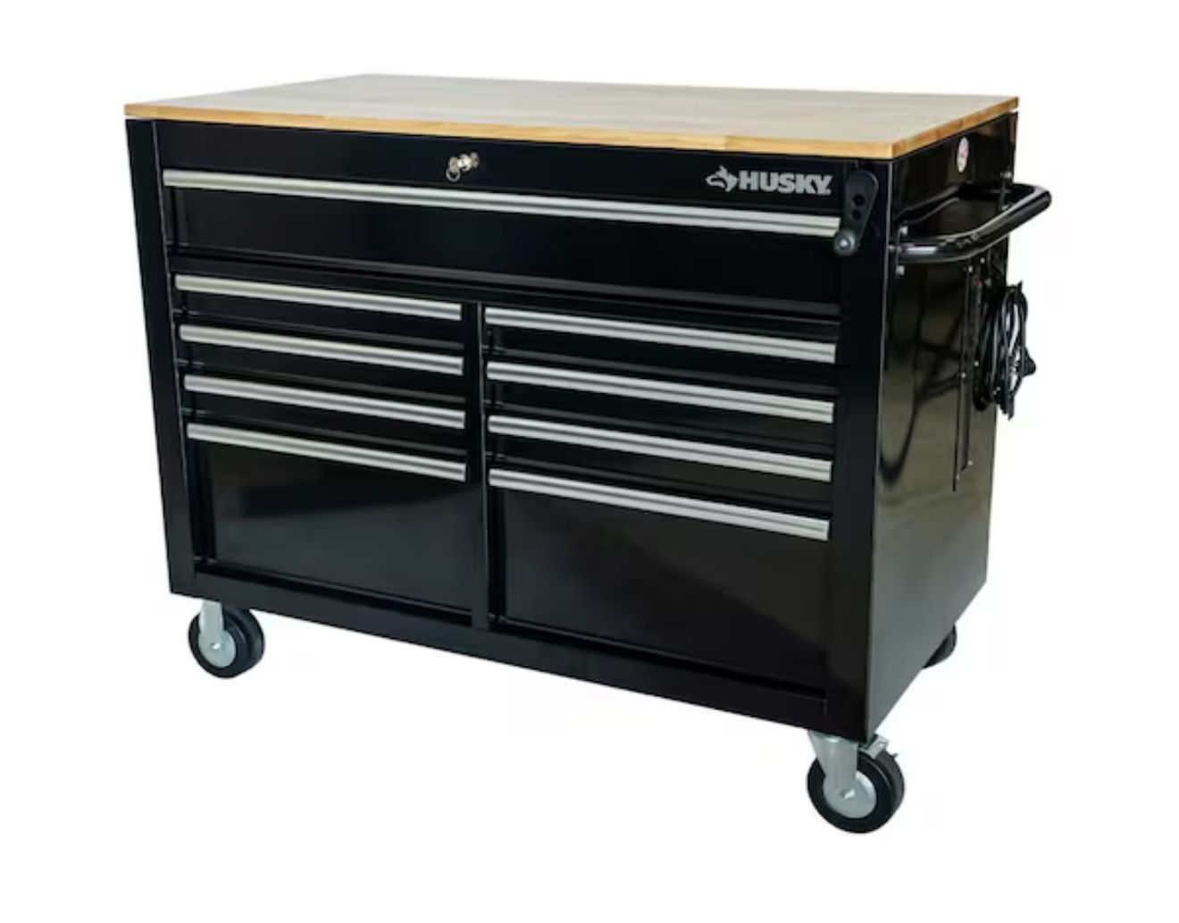Husky 46 in. x 25 in. D 9-Drawer Mobile Workbench with Adjustable Height Wood Top in Gloss Black