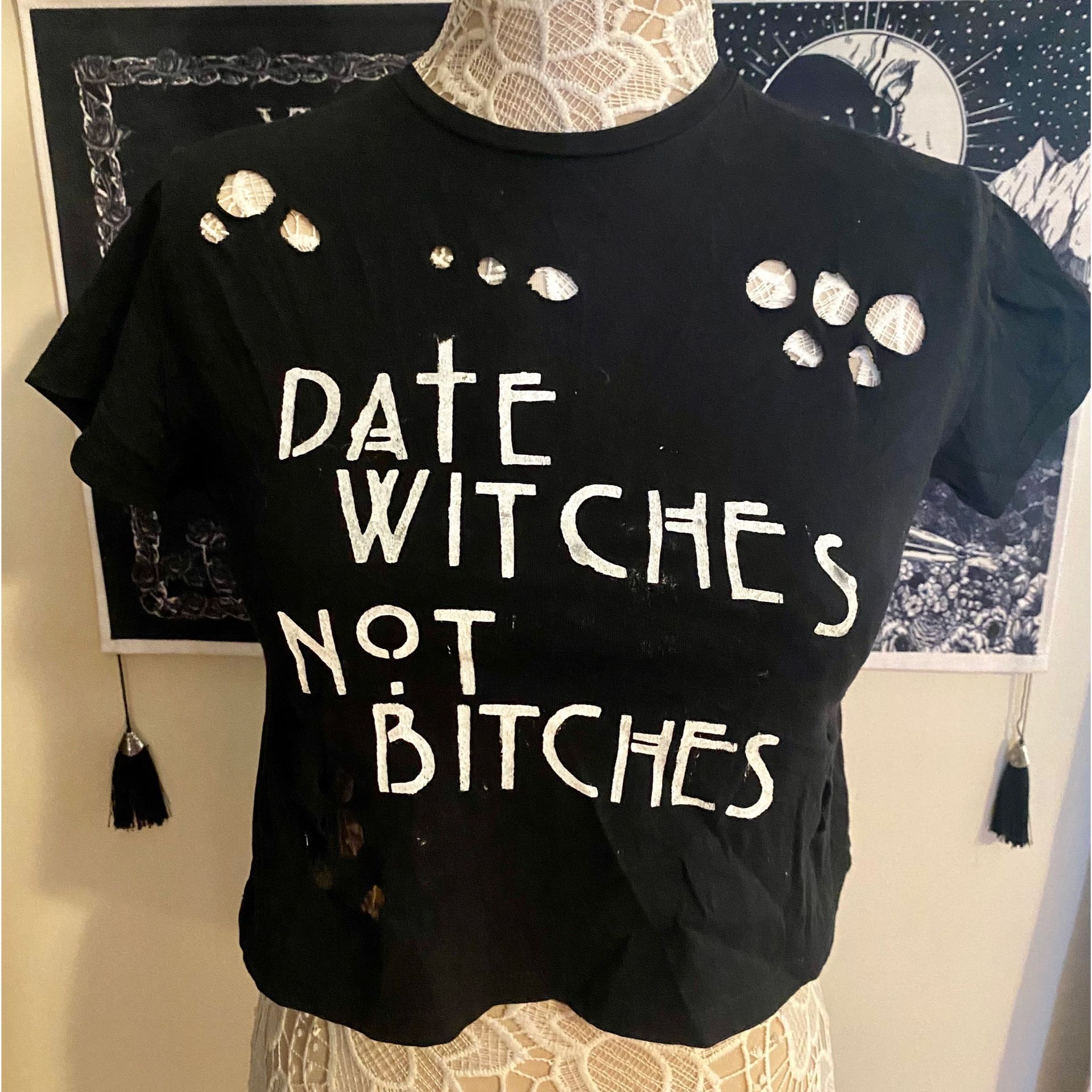 Hand painted and deconstructed black half shirt / crop top with white American Horror Story style font. “Date Witches Not B*tches” in white paint. Will fit an x small & small sized person. Front and back were cut and remade into a unique style. Thanks for looking! Open to all offers and will give discounts on multiple items.