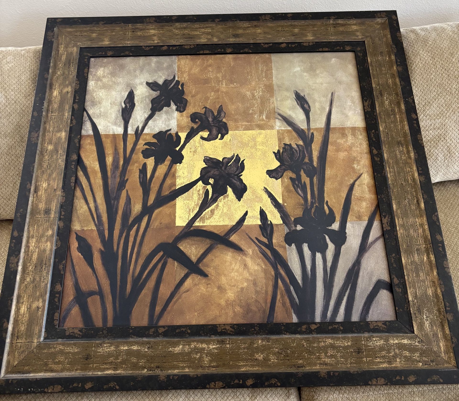 Striking 36” x 36” framed wall art featuring bold floral silhouettes set against warm, earthy tones of gold, bronze, and cream. This piece makes a great statement and adds depth and sophistication to any space. • Generous square size – perfect as a focal point • Beautiful layered design with rich metallic-style background • Substantial, high-quality frame with rustic bronze/gold finish • Works well with modern, transitional, or contemporary décor • Ready to hang This is a standout piece that instantly elevates a living room, dining area, bedroom, or office.