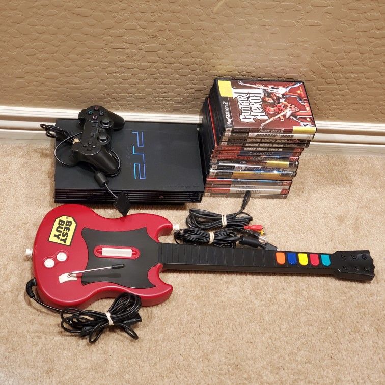 Playstation 2 with 15 games guitar hero controller and regular controller some of the games have scratches but everything works. Pick up only