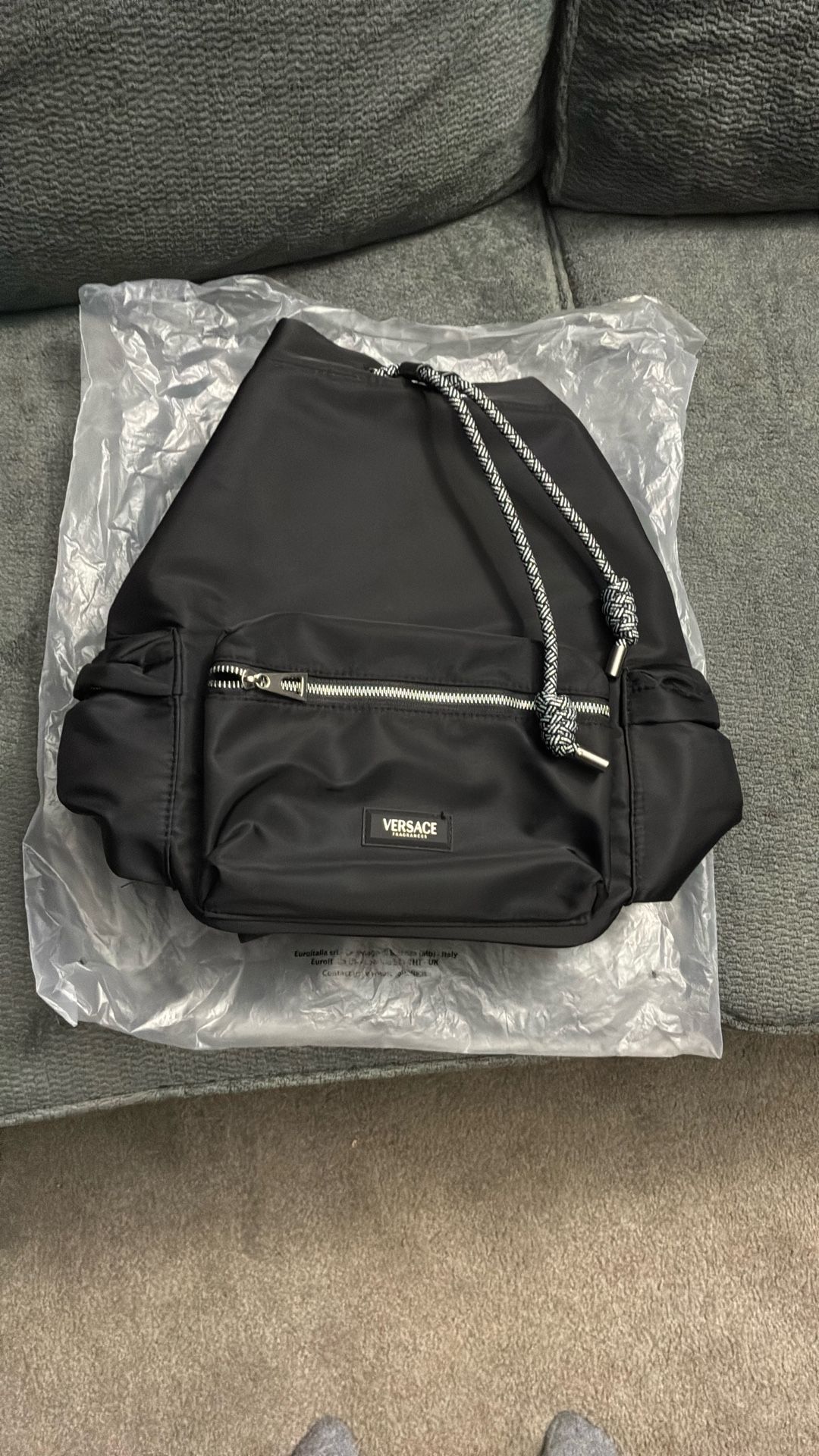 Versace Fragrances Unisex Nylon Drawstring Backpack - Black new value at retail $125- Versace Fragrances Unisex Nylon Drawstring Backpack - Black Stylish black backpack by Versace. Features a drawstring closure with a front zip pocket for easy access. Perfect for daily wear, errands, or travel. Approx. 14.5” tall.