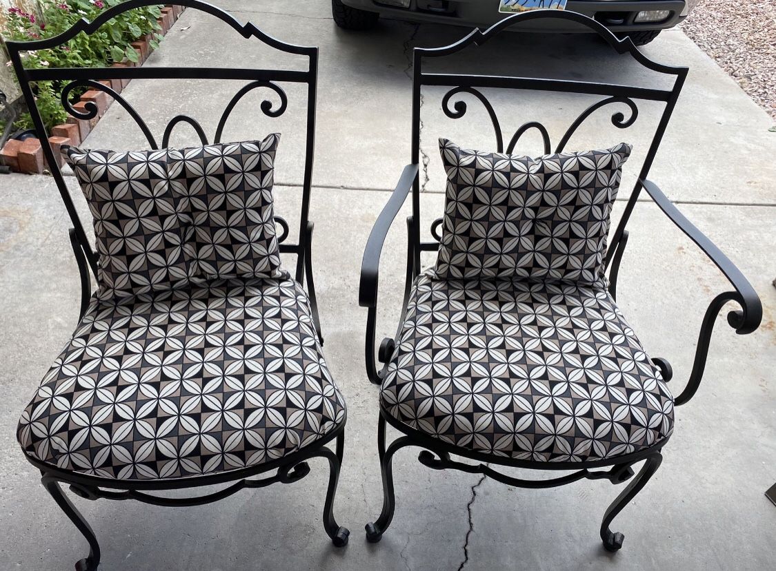 2 - Heavy Metal Patio Chairs Recent re-upholstered with back pillow. Pick up in Menifee Cash only $175/ pair
