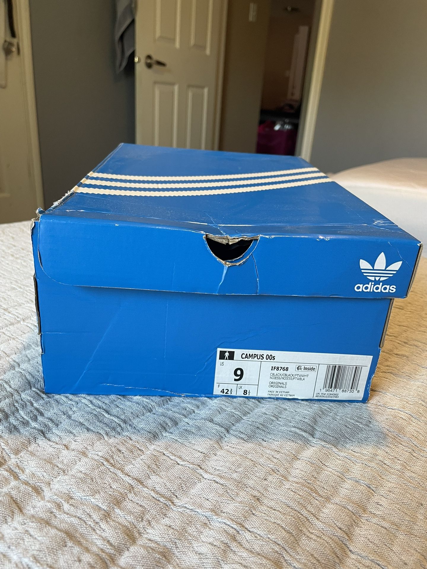 Worn once, like brand new, adidas campus all black. Box is a little beat up but the shoes are like new.